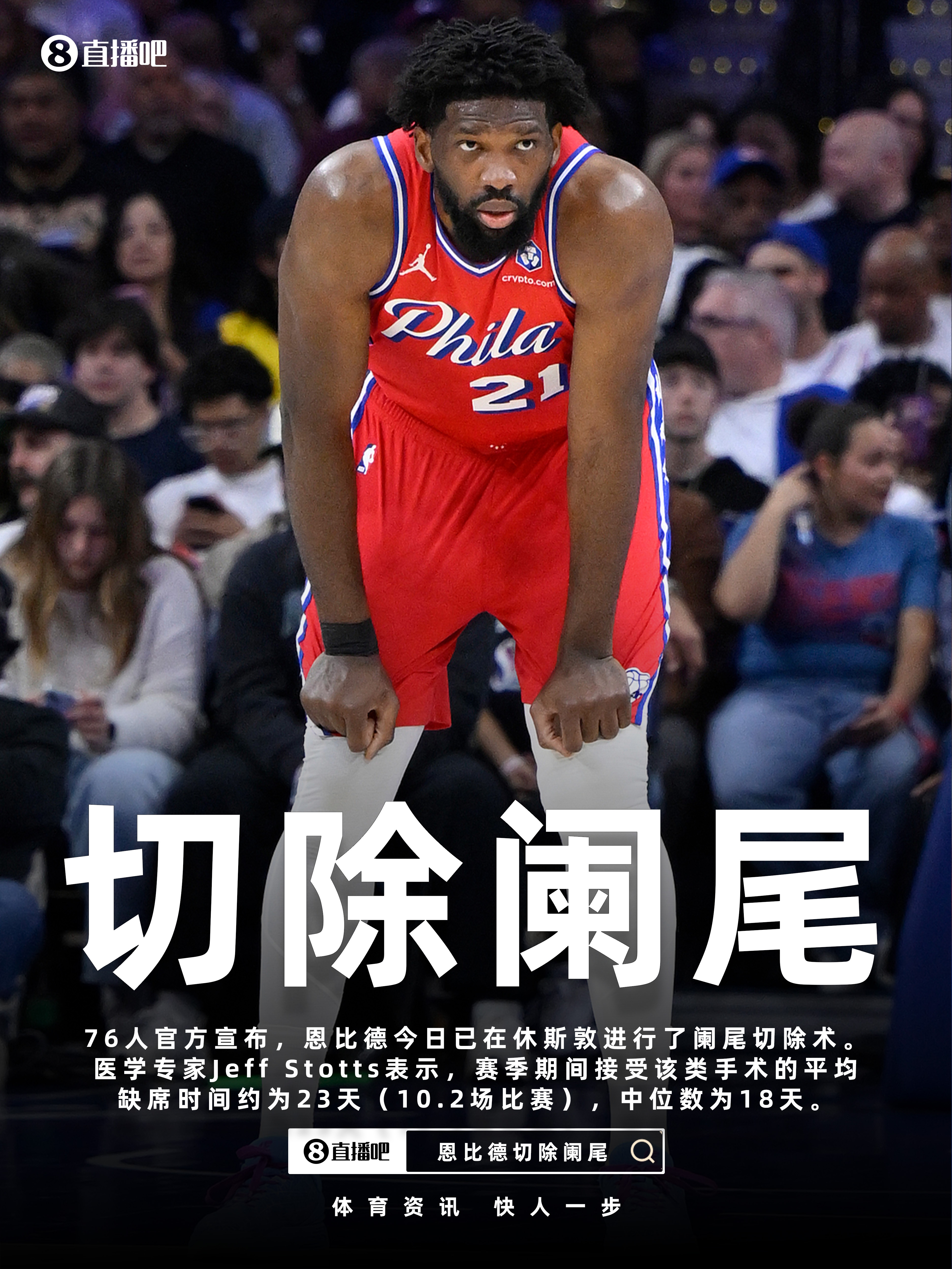 76人官宣恩比德已进行阑尾切除术 专家:赛季期间平均缺阵约23天